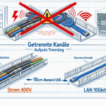 Datenkabel und Starkstrom im selben Kanal? – Warum das keine gute Idee ist! - 10Gbit-Netzwerkkabel und 400V-Drehstromleitung ( z.B. 16A für Wallbox) aus dem Sicherungskasten bzw. Serverschrank in einem durch verlegen – klingt nach effizienter Platzersparnis, besonders wenn Kabelkanäle und Unterputzführungen begrenzt sind. Anwendungsfall (von einem Freund): Vom Sicherungskasten/Serverschrank aus müssen verschiedene Leitungen in... Weiterlesen →