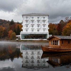 Hinter dem Boot, im Hintergrund, soll das Hotel sein. Es ist modern, aus hellem Marmor gebaut, hat vier Stockwerke und auf jedem Obergeschoss gibt’s weiße Balkone vor den Fenstern. Unten im Erdgeschoss gibt’s viel Glas – wohl das Restaurant, das in der Geschichte eine Rolle spielt. Das Hotel steht einsam in der Landschaft, damit man die ruhige, fast schon magische Stimmung des Ortes spürt.