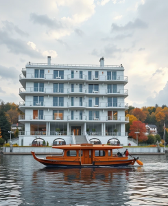 Hinter dem Boot, im Hintergrund, soll das Hotel sein. Es ist modern, aus hellem Marmor gebaut, hat vier Stockwerke und auf jedem Obergeschoss gibt’s weiße Balkone vor den Fenstern. Unten im Erdgeschoss gibt’s viel Glas – wohl das Restaurant, das in der Geschichte eine Rolle spielt. Das Hotel steht einsam in der Landschaft, damit man die ruhige, fast schon magische Stimmung des Ortes spürt.