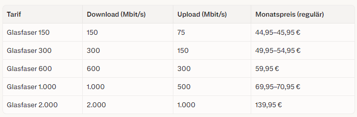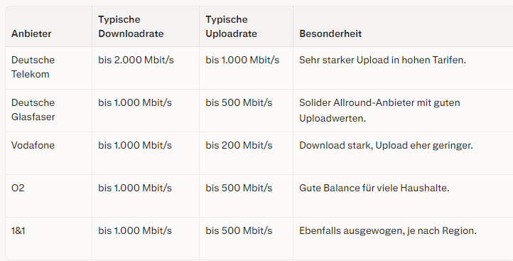 Die Deutsche Telekom hebt sich in den genannten Übersichten vor allem beim maximalen Upload ab, während Deutsche Glasfaser, O2 und 1&1 meist im Bereich von 500 Mbit/s Upload liegen. Verivox nennt bei Glasfasertarifen generell Downloadwerte von 150 bis 1.000 Mbit/s und Uploadwerte von 75 bis 500 Mbit/s, in ausgewählten Regionen sogar bis 1.000 Mbit/s Upload.