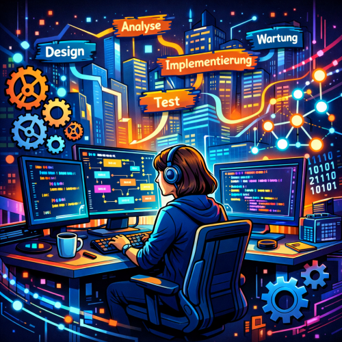 Die Entwicklung von Software ist ein iterativer Prozess, der mehrere Phasen umfasst, darunter Analyse, Design, Implementierung, Test und Wartung. Während der Analysephase werden die Anforderungen erfasst, während im Design die Struktur und das Verhalten der Software geplant werden. Die Implementierung beinhaltet das eigentliche Schreiben des Codes, gefolgt von Tests, um sicherzustellen, dass die Software wie erwartet funktioniert. Schließlich erfordert die Wartung die Aktualisierung und Fehlerbehebung der Software im Laufe der Zeit.