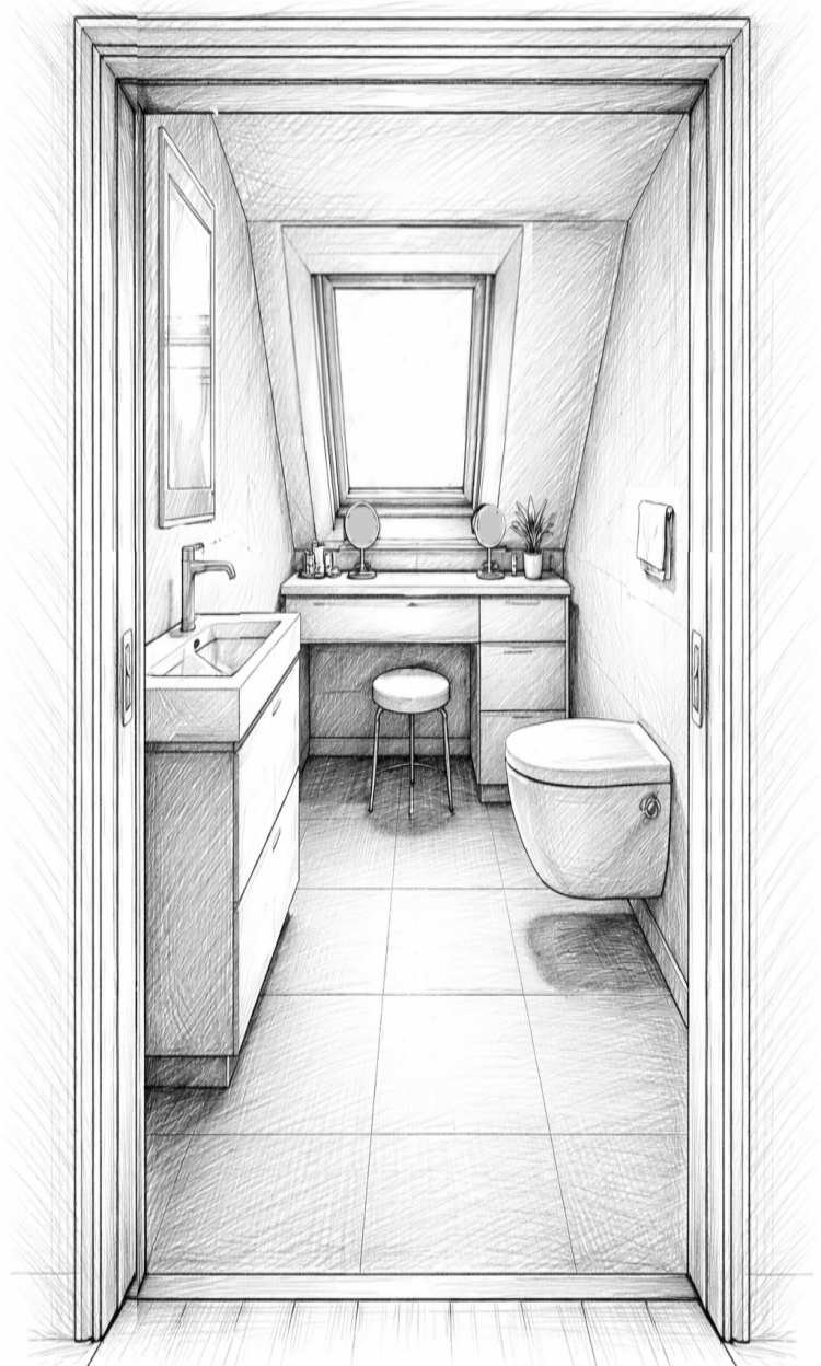 Diese Bilder wurden hauptsächlich erstellt, um den entsprechenden Handwerkern zu veranschaulichen, wie die verschiedene Räume gestaltet werden sollen. Diese meisten Bilder sind nicht maßstabsgetreue Skizzen. In einigen Fällen mache ich nur die Vorbereitung. Es kommen Schreiner (Schränke und Regale), Bauarbeiter (Toilette/Waschbecken, Türen und Außentreppen), Klimatechniker (Klimaanlage-Erweiterung) und Dachdecker (Dachfenster und Außenrollos) für die Außenrollos zum Einsatz.