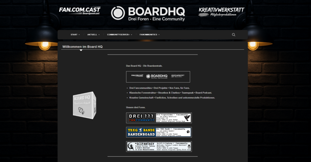 Das BoardHQ dient als zentrale Plattform für unsere drei Community-Boards sowie als Anlaufstelle für den Boardpodcast und verschiedene Mitgliederproduktionen. Dazu zählen insbesondere Geschichten, FanFictions und Hörspiele – allesamt nichtkommerzielle Projekte, die mit viel Engagement und Kreativität von der Community gestaltet werden.