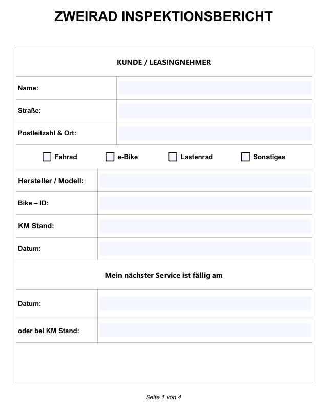 Die Dokumente liegen als ausfüllbare PDF-Formulare vor und bilden sämtliche relevanten Prüf- und Wartungspunkte einer fachgerechten Fahrrad- bzw. Zweiradinspektion einschließlich Funktionskontrolle und ggf. Probefahrt ab. Nach Abschluss der Arbeiten werden alle Felder ausgefüllt, als Kontroll- und Servicebericht archiviert und dem Kunden als nachvollziehbarer Inspektionsnachweis ausgedruckt ausgehändigt.